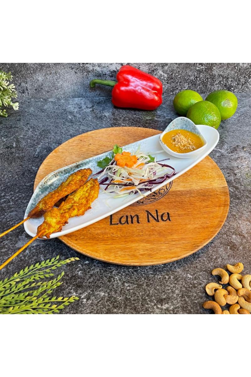 Sataymarinert kylling på spyd. Serveres med peanøttsaus. (Inneholder: Peanøtter, fisk og soya)
