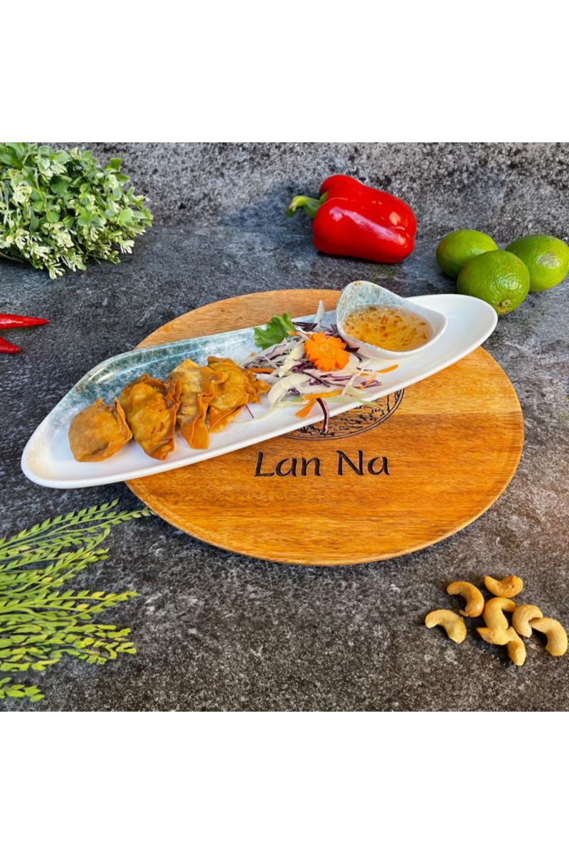 Friterte wontons med kylling. Serveres med søt plommesaus. (Inneholder: Hvetegluten og soya)