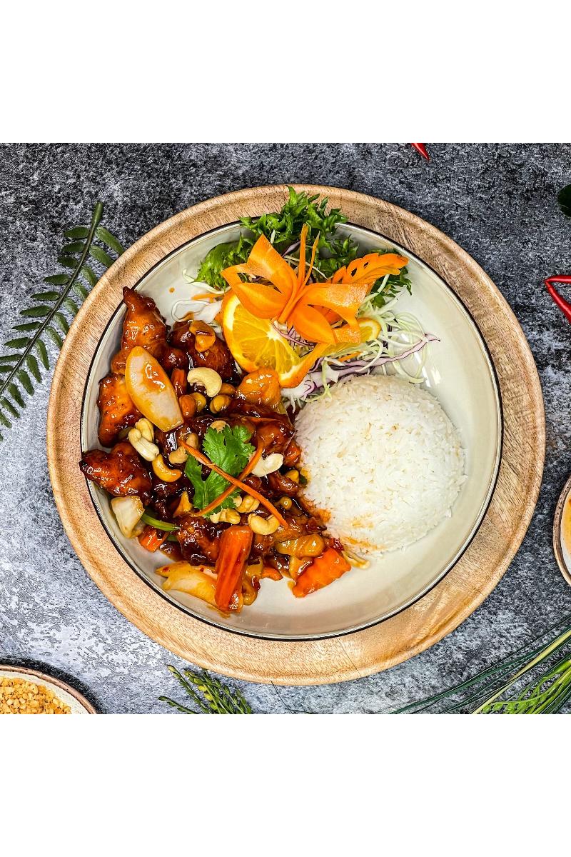 Wok med cashewnøtter, løk og paprika. Flamberes på wokpanne med en medium spicy chilisaus for å gi en unik, karamellisert smak. (Inneholder: Hvetegluten, egg, soya, melk, nøtter og bløtdyr)